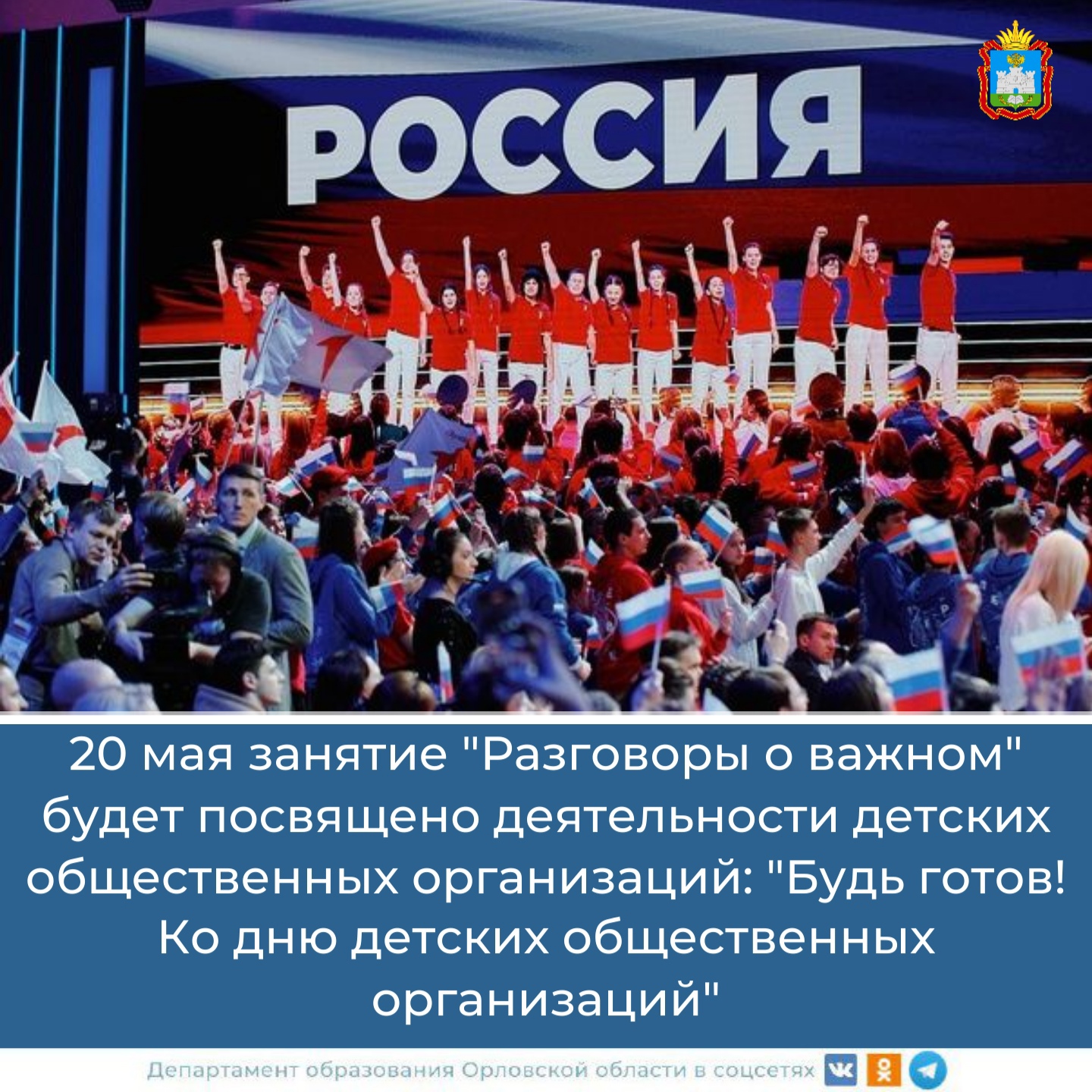 20 мая занятие "Разговоры о важном" будет посвящено деятельности детских общественных организаций: "Будь готов! Ко дню детских общественных организаций".