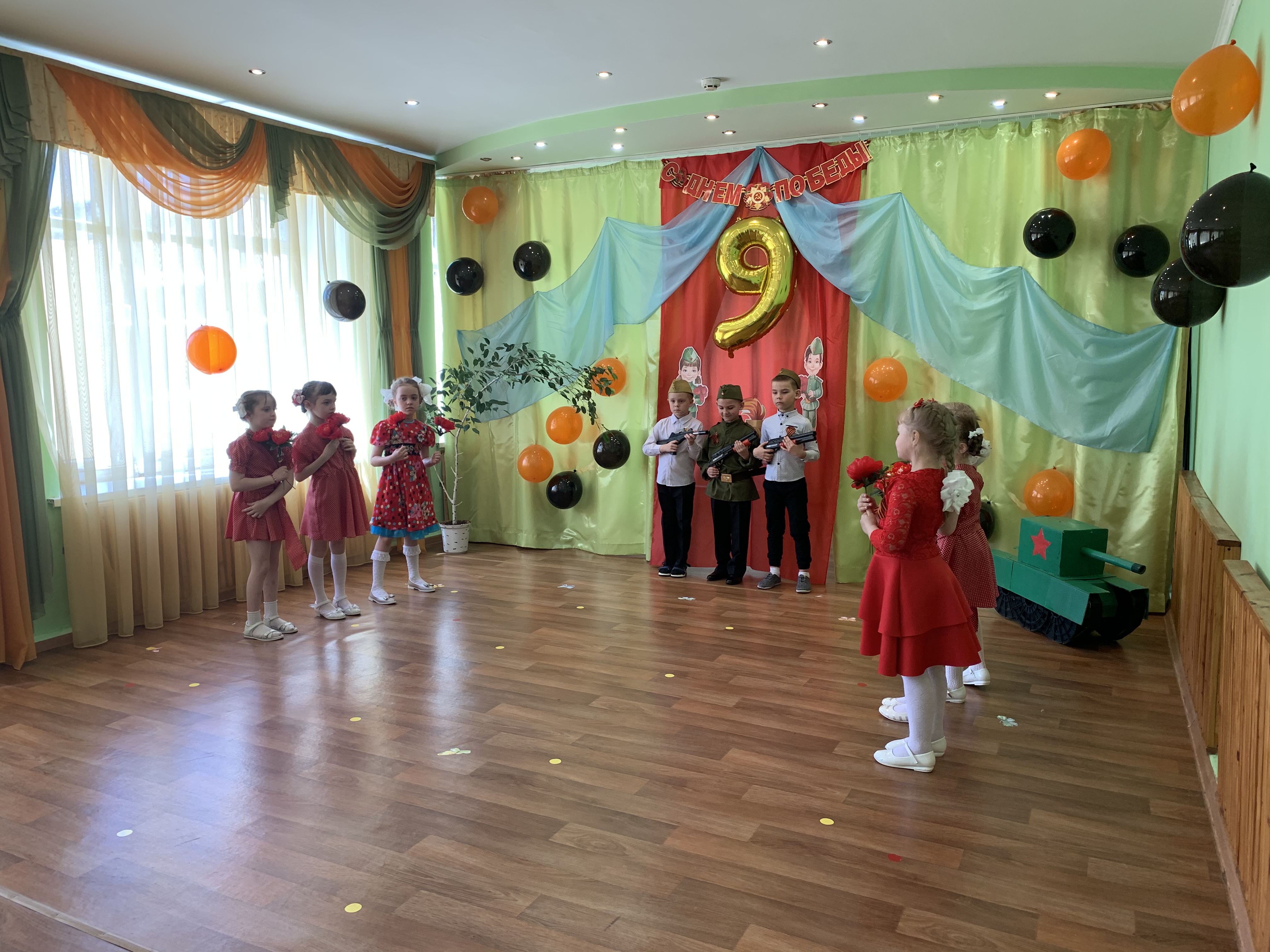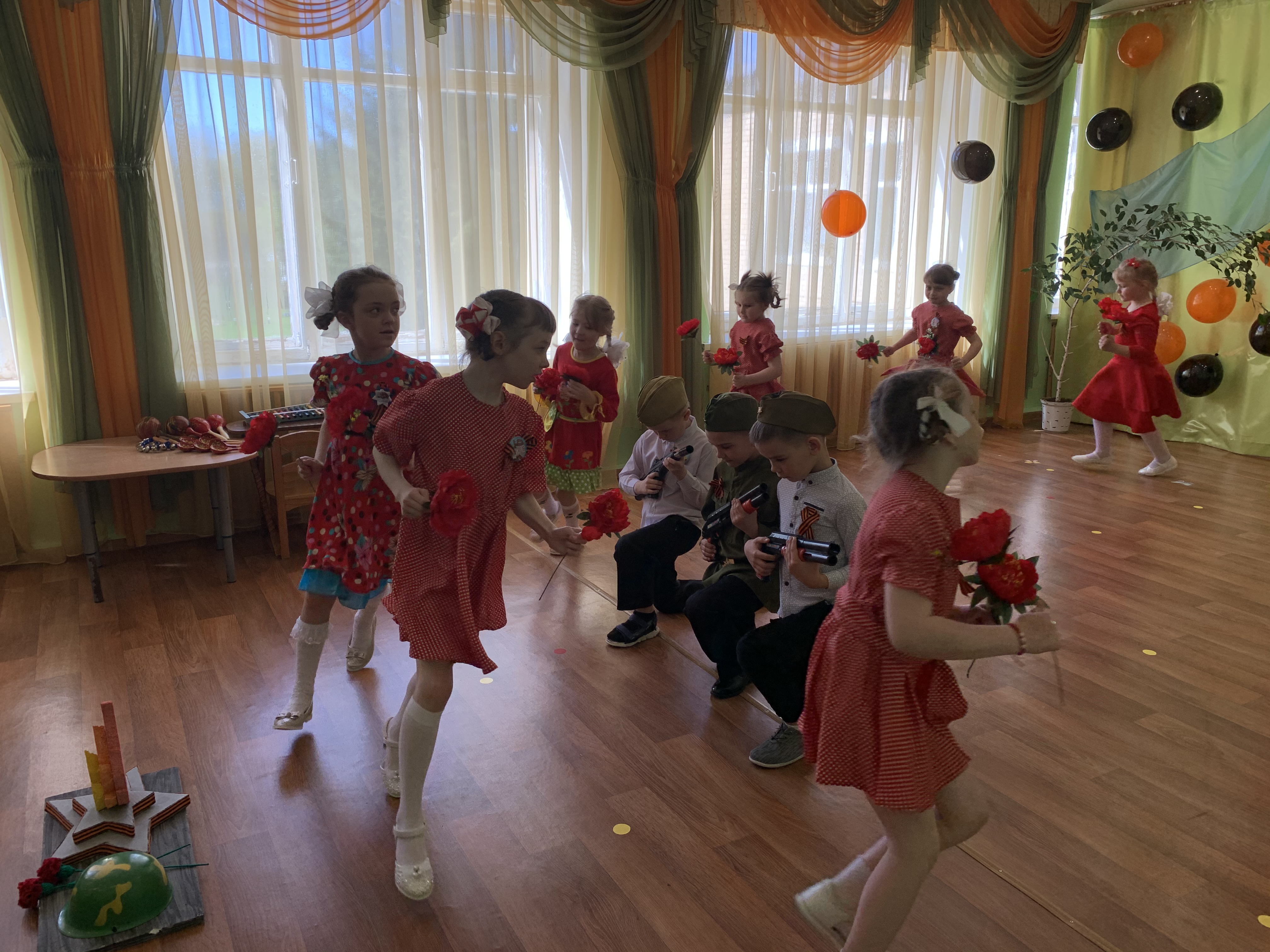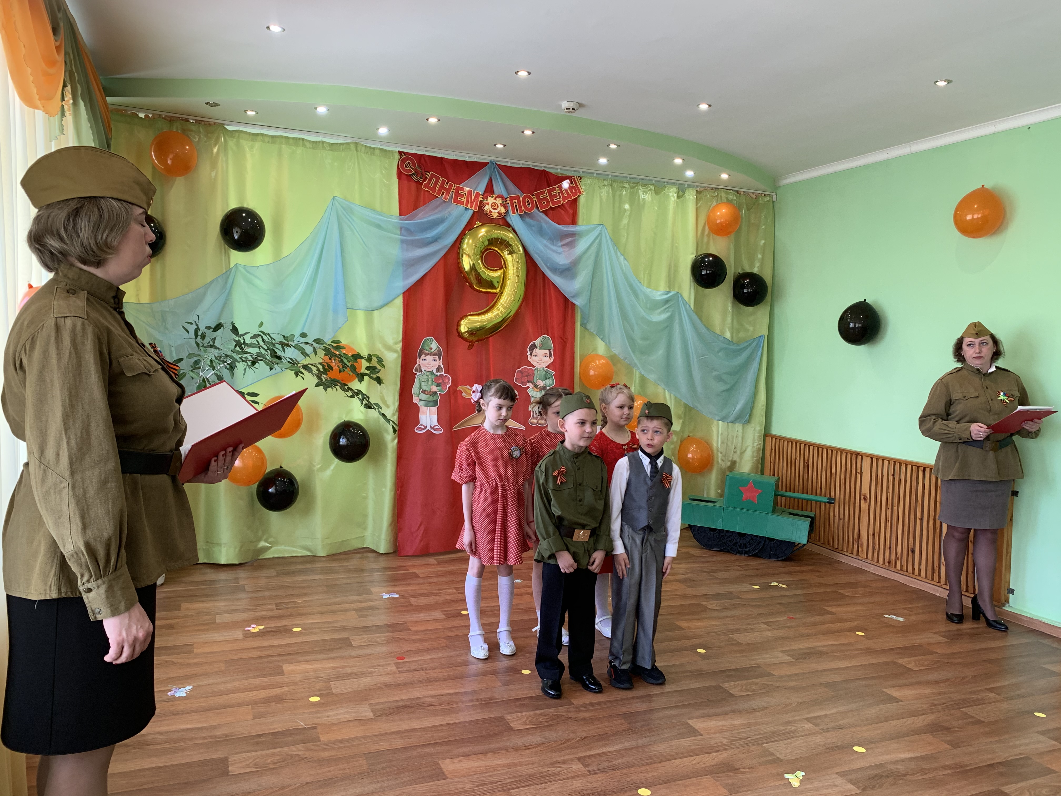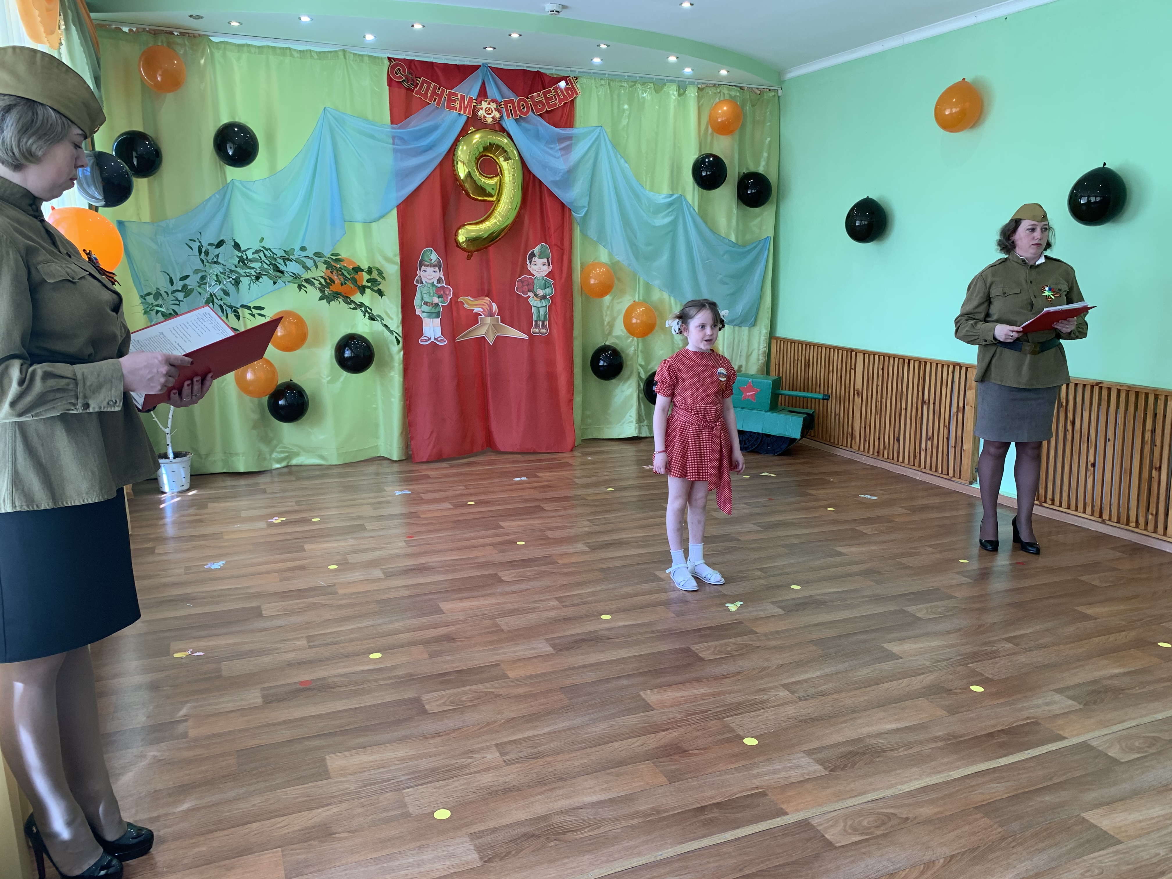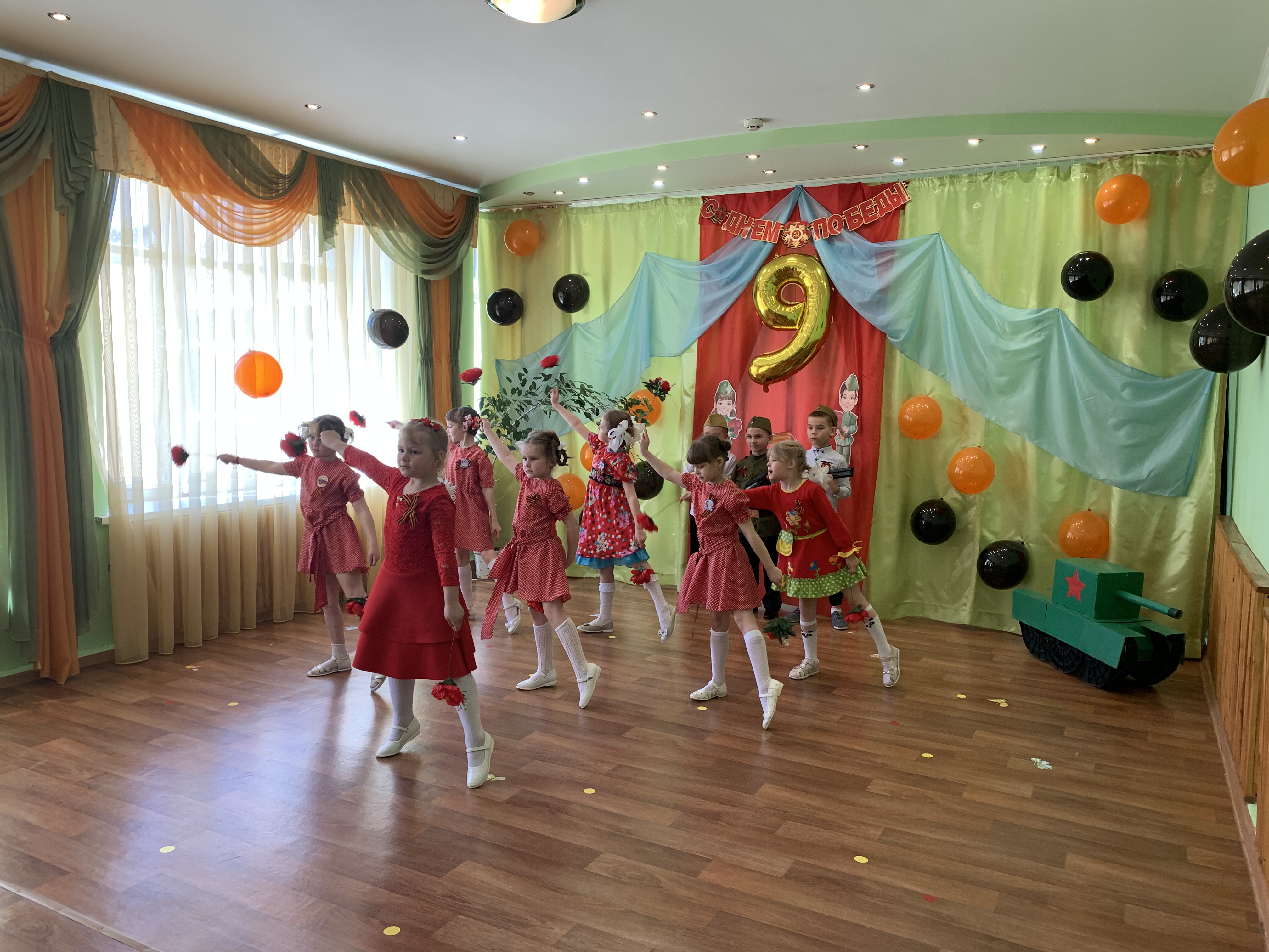 Предварительно с воспитанниками были проведены беседы о подвигах советских людей, оформлены родительские уголки, украшен зал, были сделаны всем обучающимся георгиевские ленточки – символ Дня Победы, а сам праздник стал итогом этих мероприятий. Дети слушали стоя Гимн России, аудиозапись голоса Левитана о начале войны и запись песни «Вставай страна огромная». Дошкольники исполнили песни – «Прадедушка», «Катюша», «Солдат молоденький», «Наша родина сильна». Показали танцы «Синий платочек», «Красные маки», а также читали стихи о любви к Родине, о силе, отваге солдат.