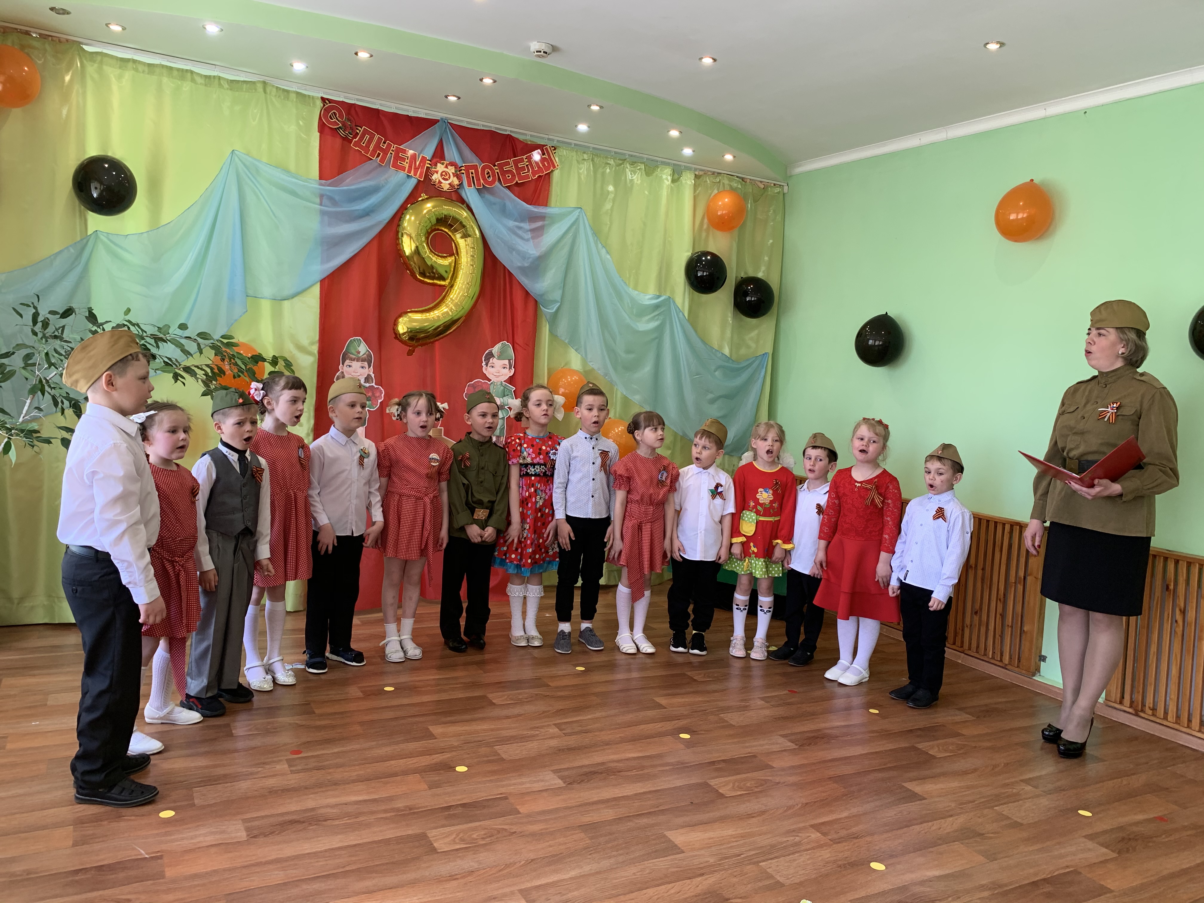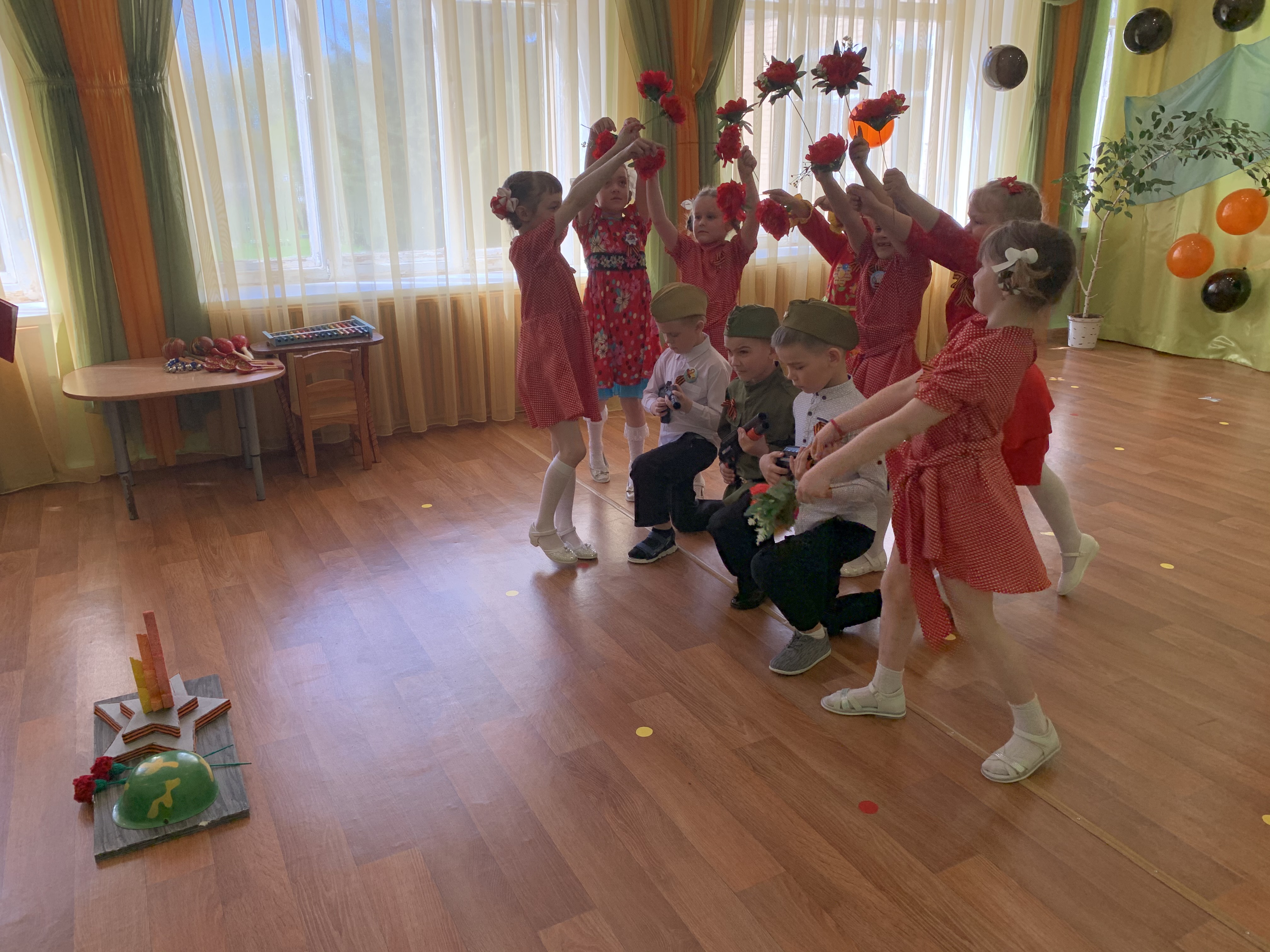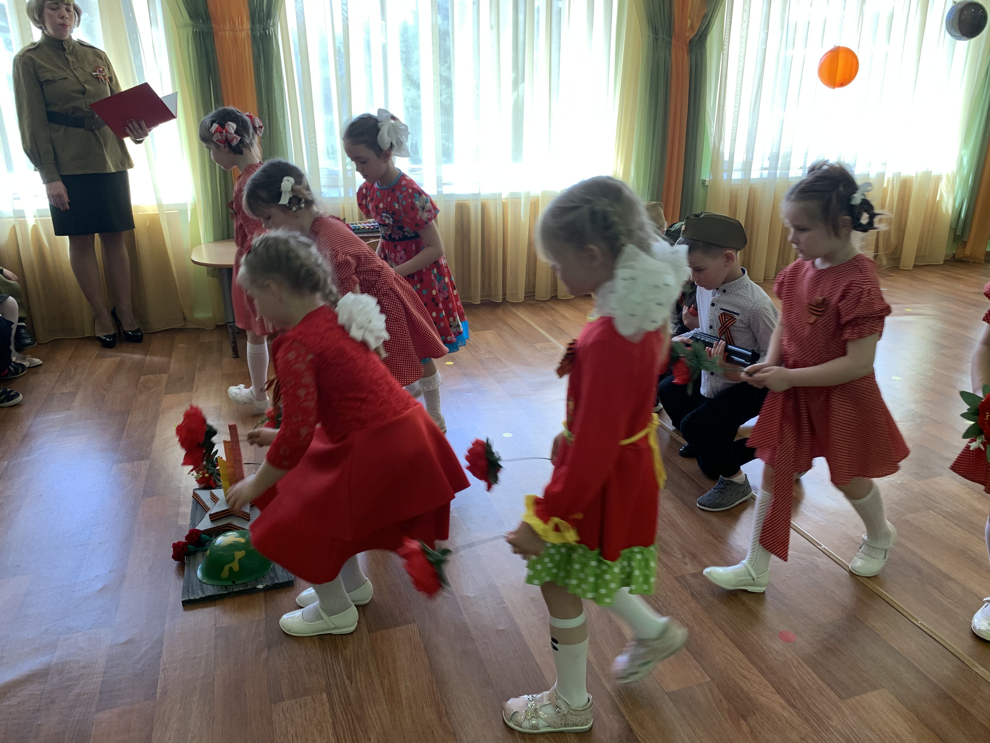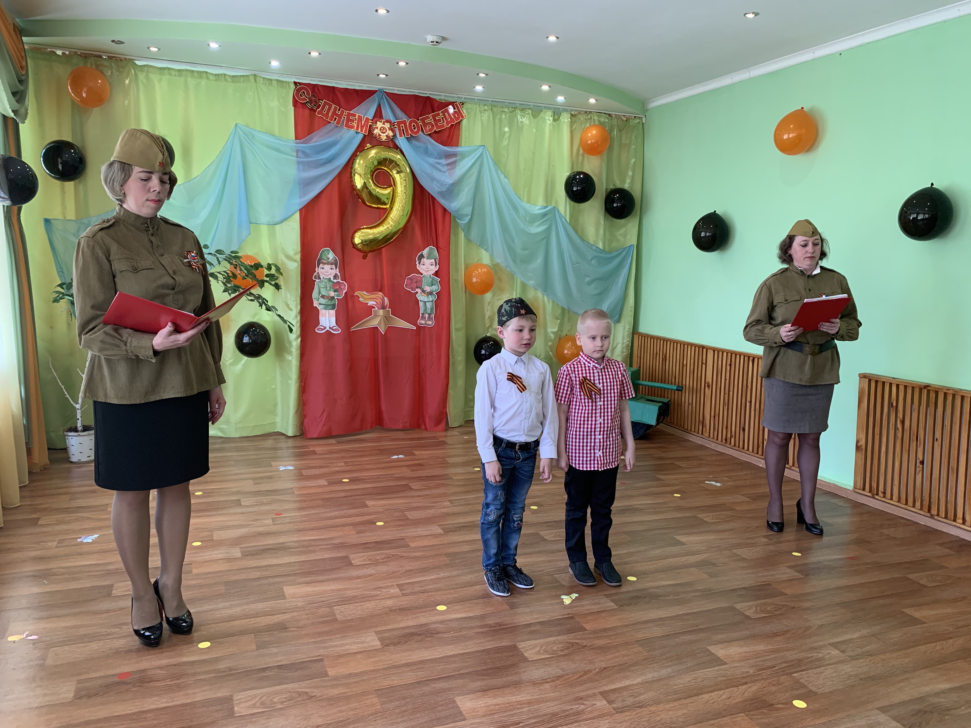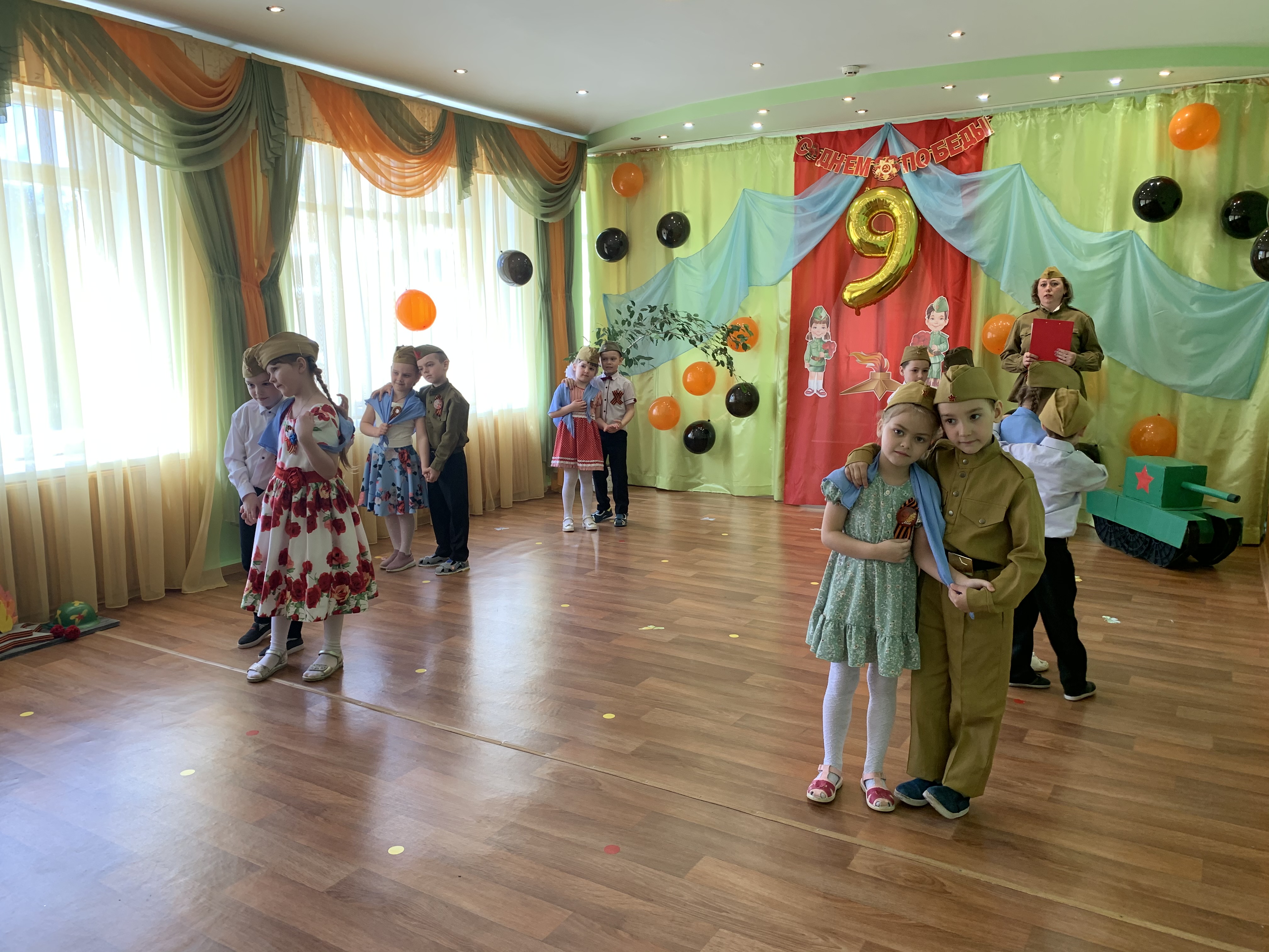 Предварительно с воспитанниками были проведены беседы о подвигах советских людей, оформлены родительские уголки, украшен зал, были сделаны всем обучающимся георгиевские ленточки – символ Дня Победы, а сам праздник стал итогом этих мероприятий. Дети слушали стоя Гимн России, аудиозапись голоса Левитана о начале войны и запись песни «Вставай страна огромная». Дошкольники исполнили песни – «Прадедушка», «Катюша», «Солдат молоденький», «Наша родина сильна». Показали танцы «Синий платочек», «Красные маки», а также читали стихи о любви к Родине, о силе, отваге солдат.
