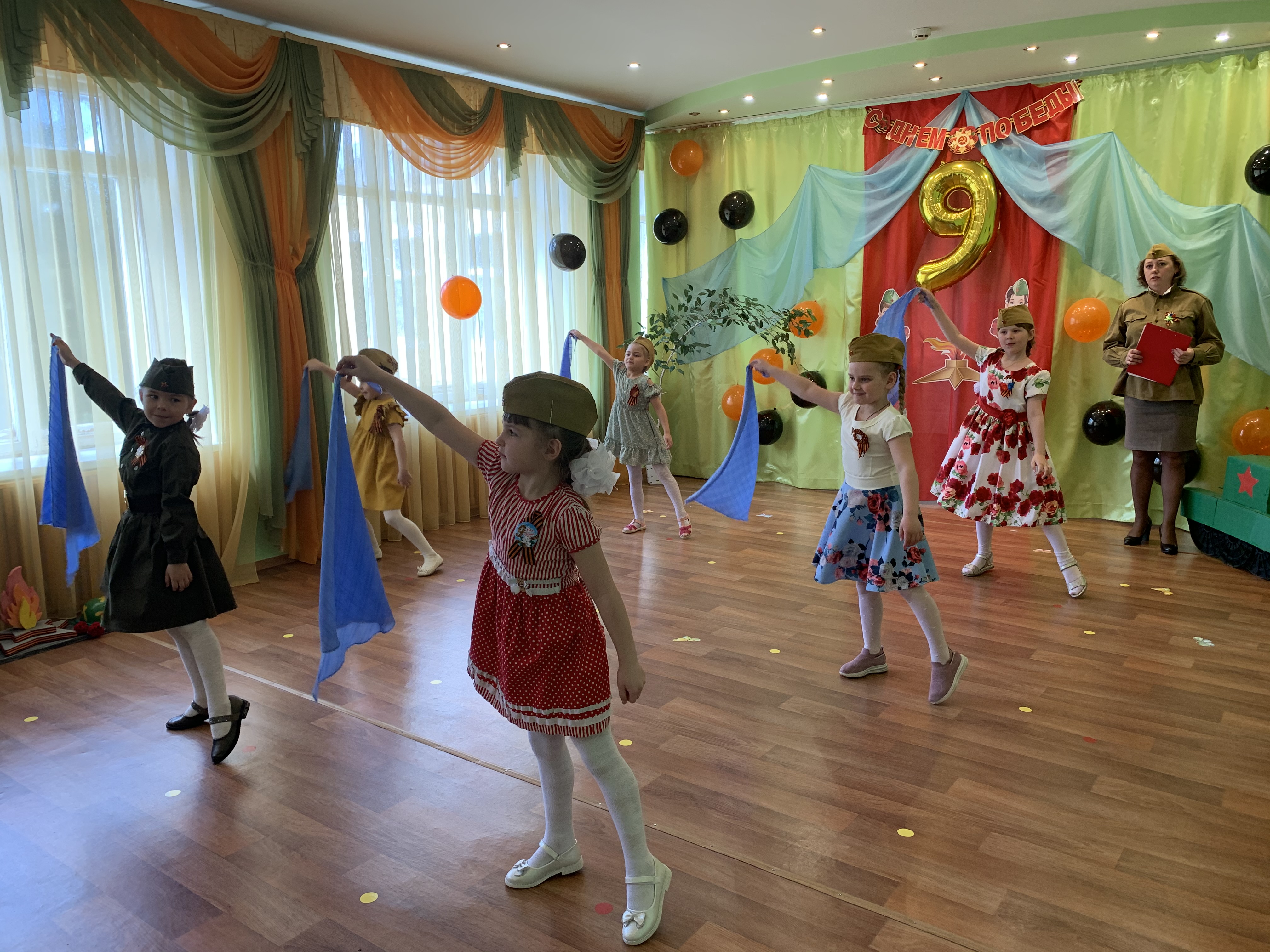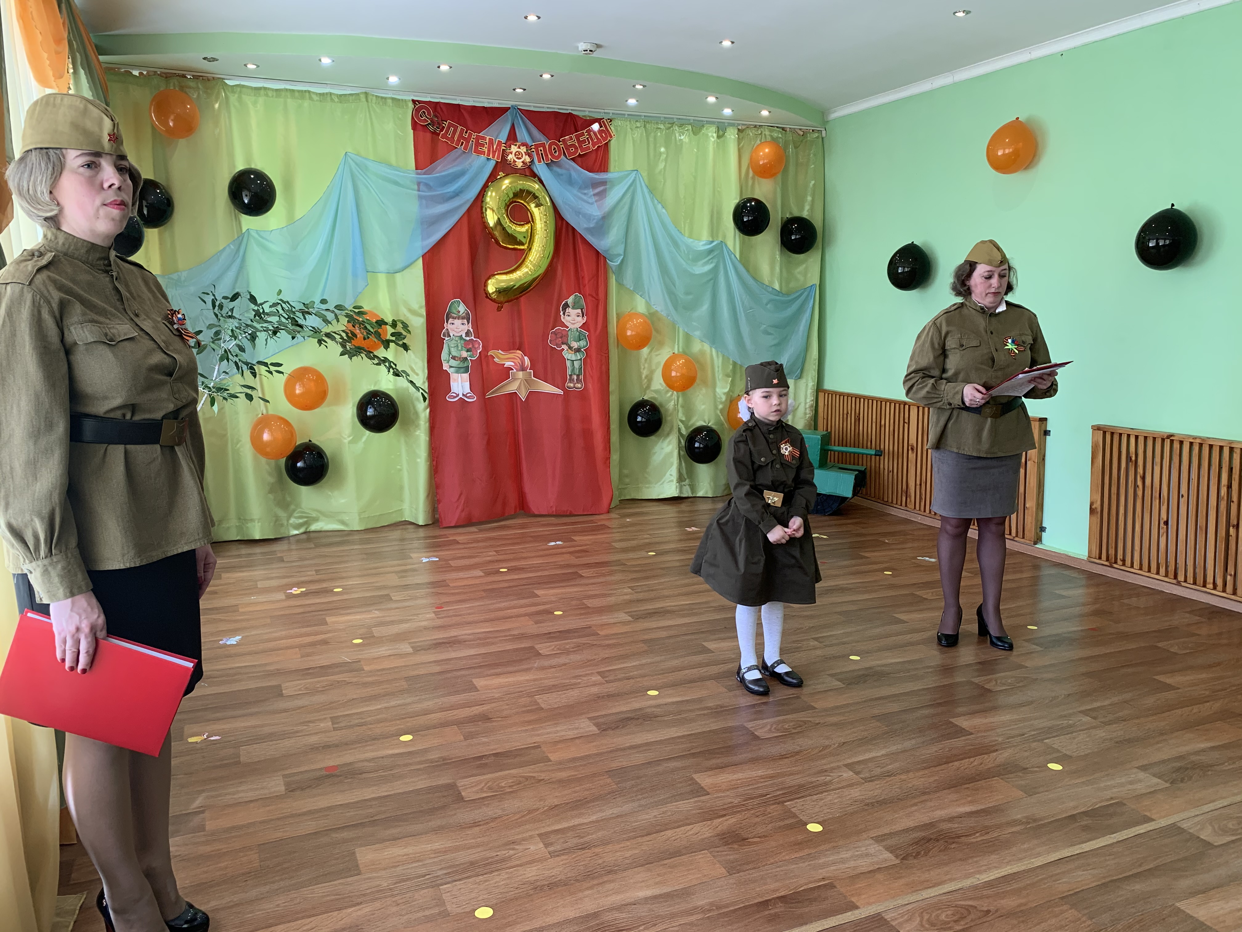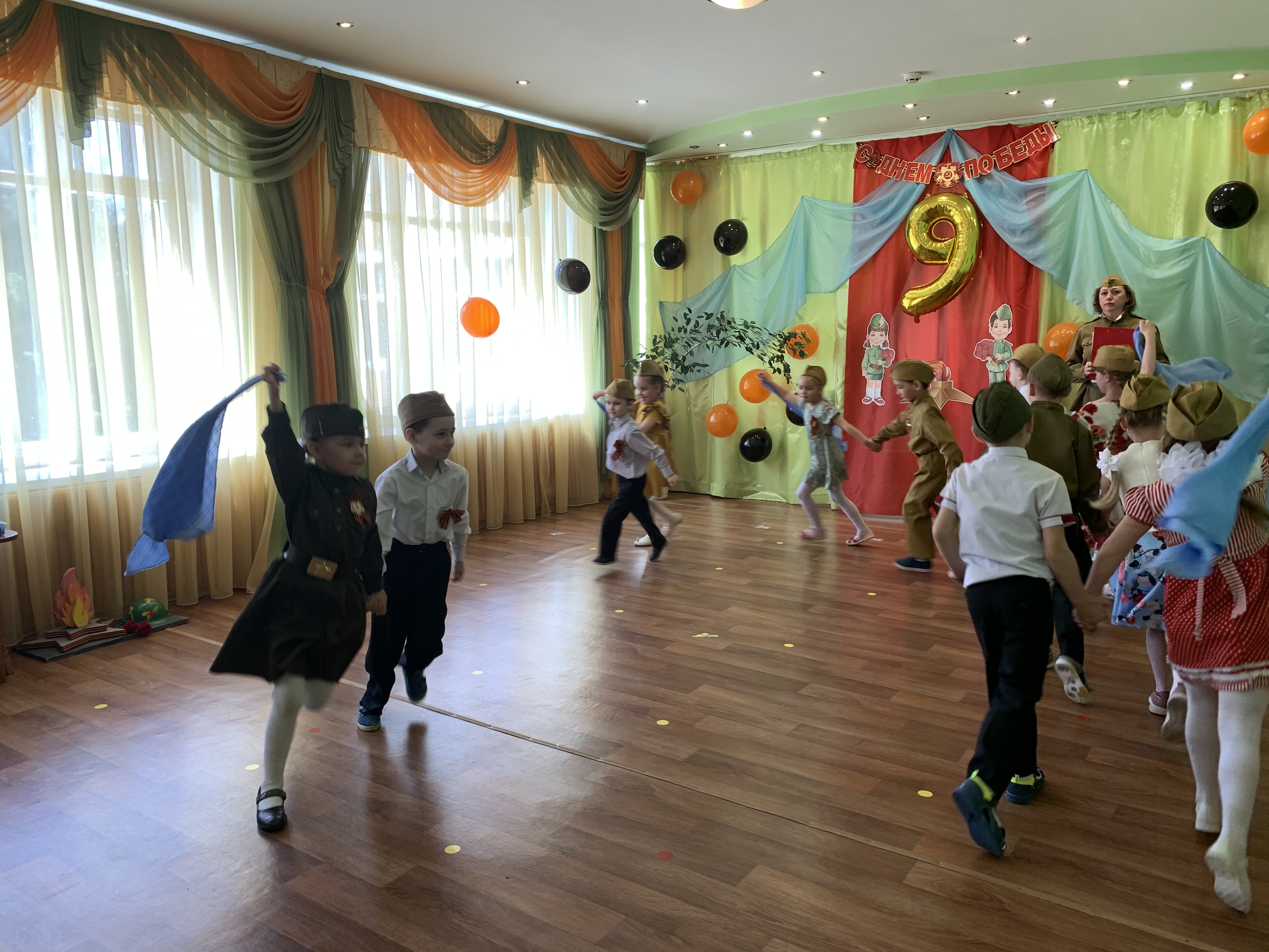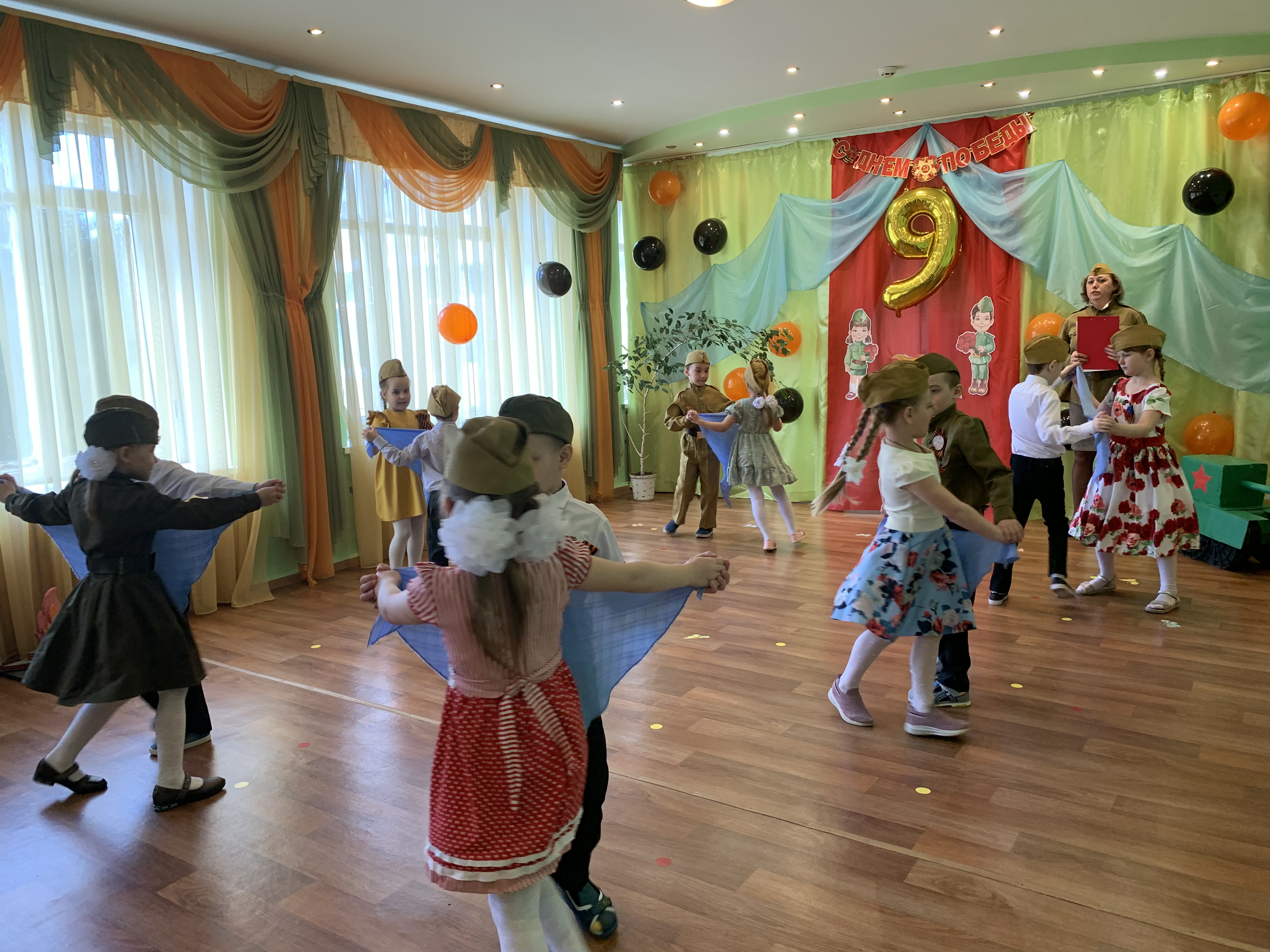 Предварительно с воспитанниками были проведены беседы о подвигах советских людей, оформлены родительские уголки, украшен зал, были сделаны всем обучающимся георгиевские ленточки – символ Дня Победы, а сам праздник стал итогом этих мероприятий. Дети слушали стоя Гимн России, аудиозапись голоса Левитана о начале войны и запись песни «Вставай страна огромная». Дошкольники исполнили песни – «Прадедушка», «Катюша», «Солдат молоденький», «Наша родина сильна». Показали танцы «Синий платочек», «Красные маки», а также читали стихи о любви к Родине, о силе, отваге солдат.