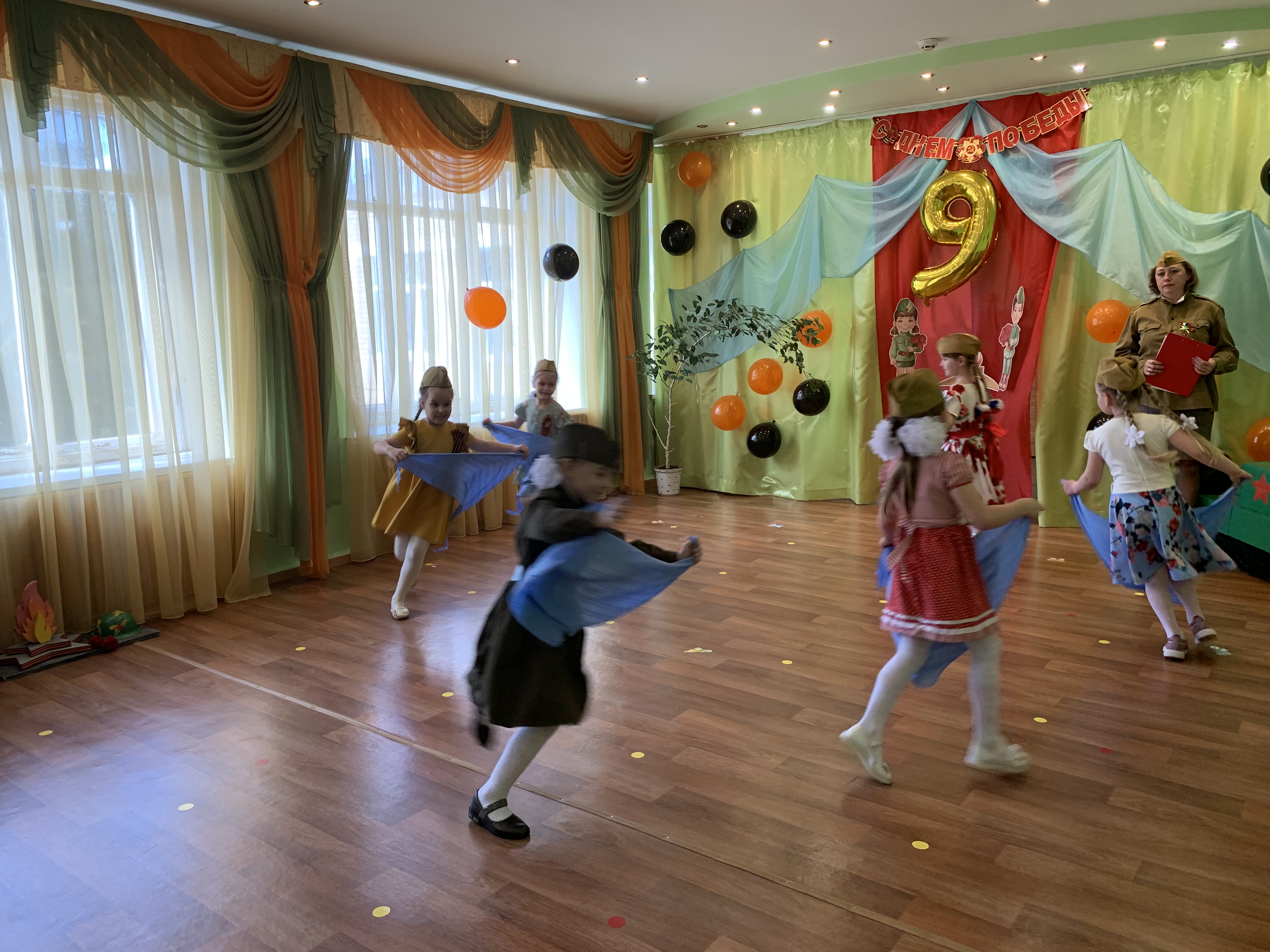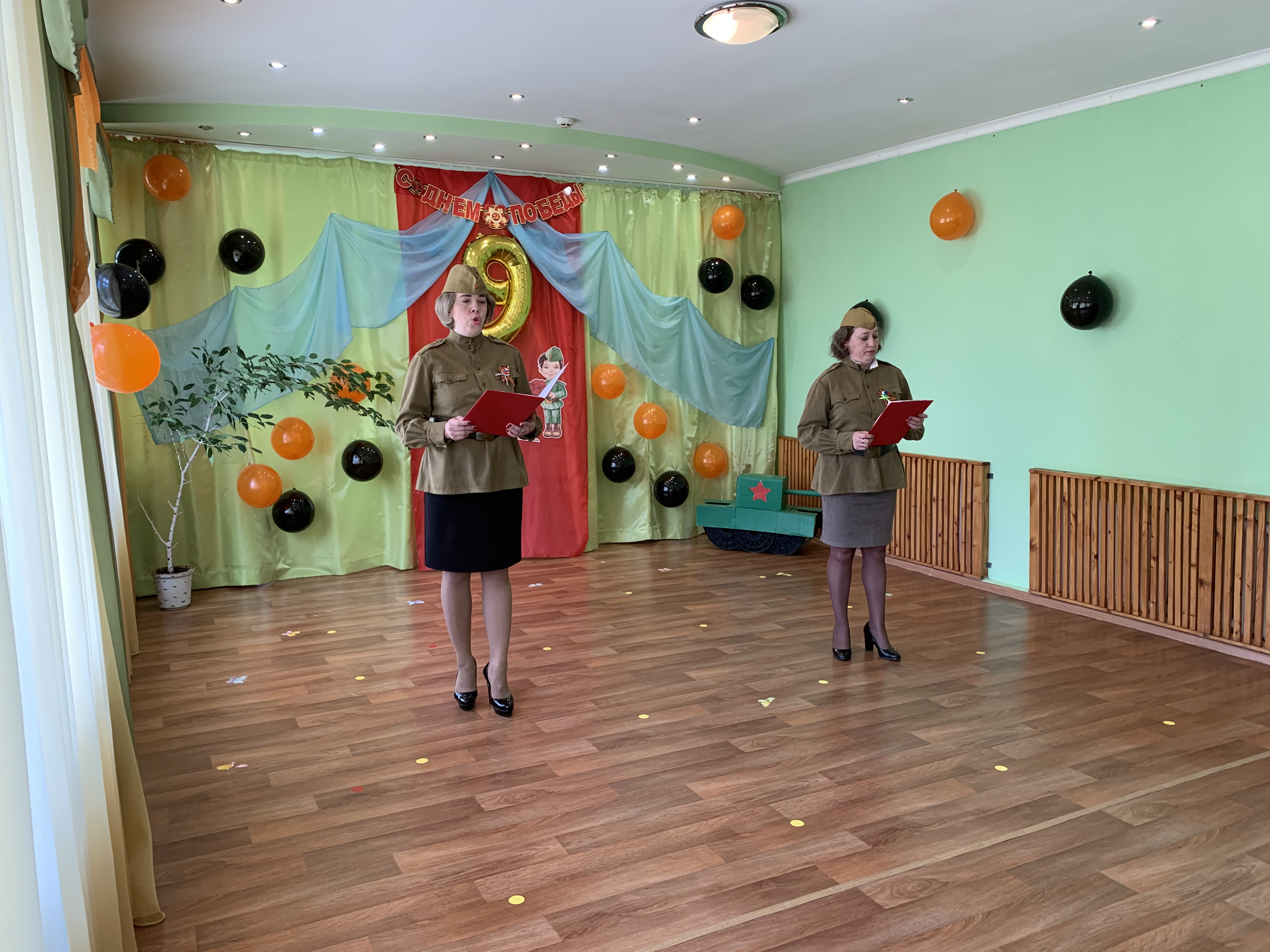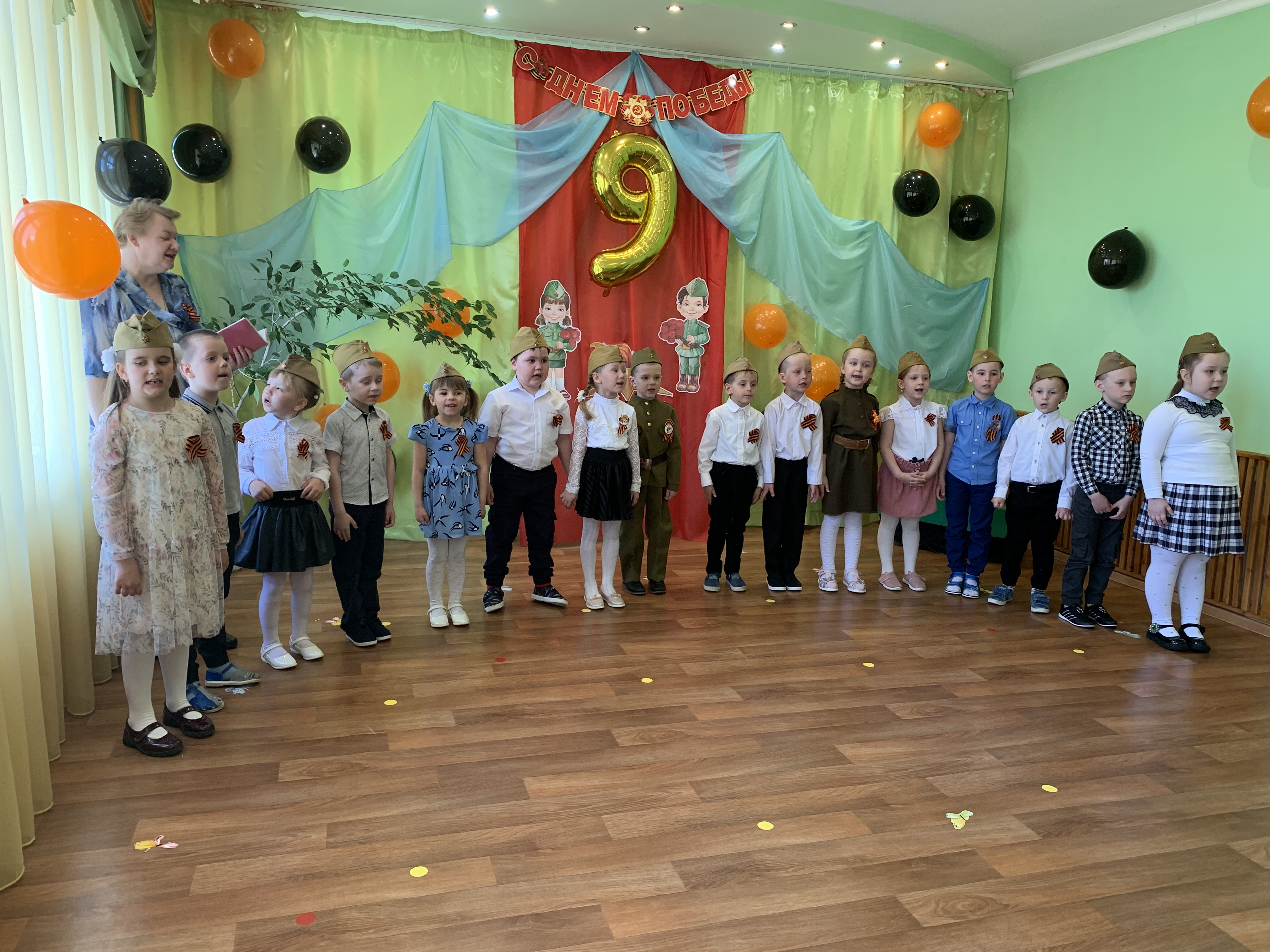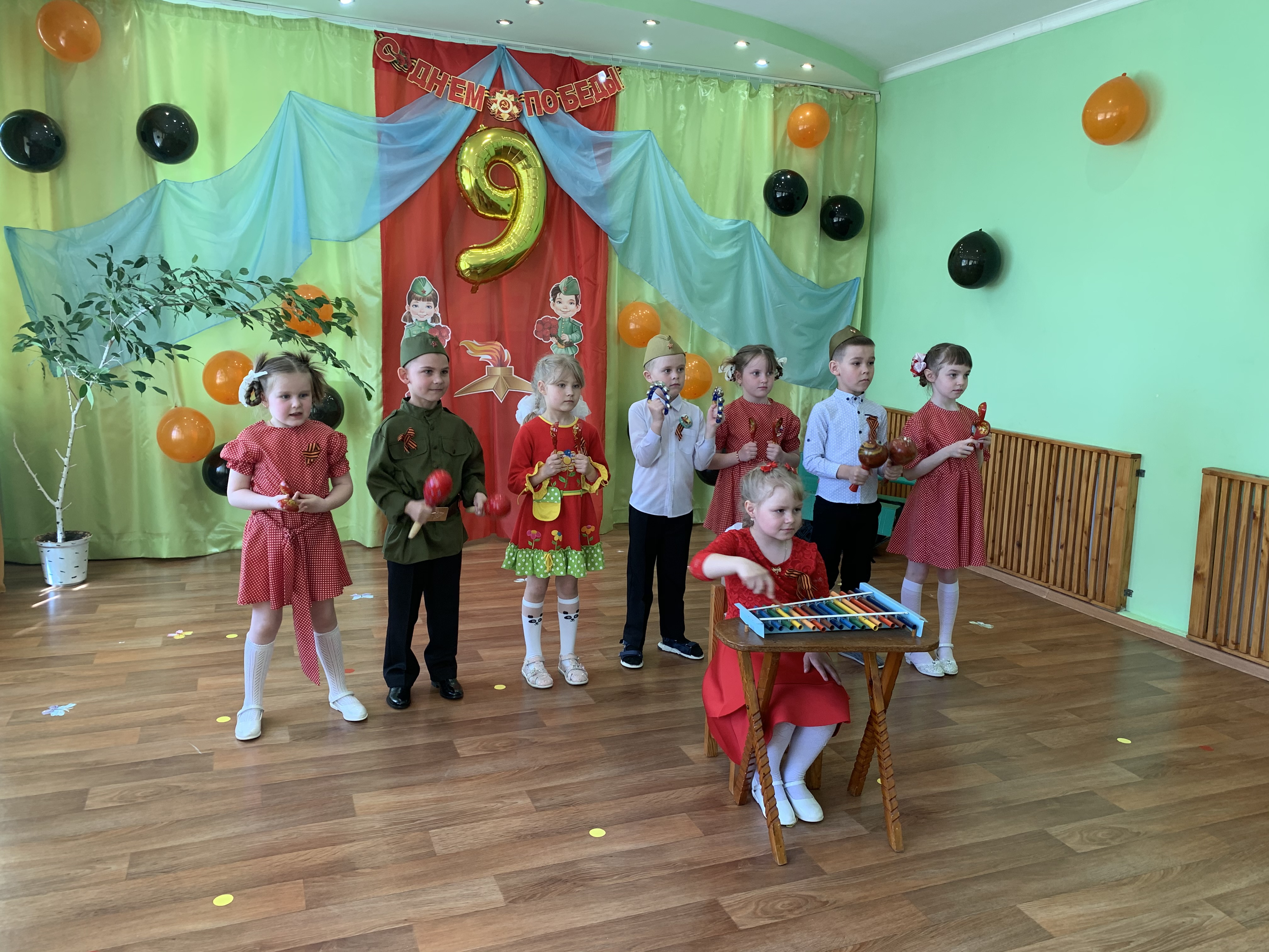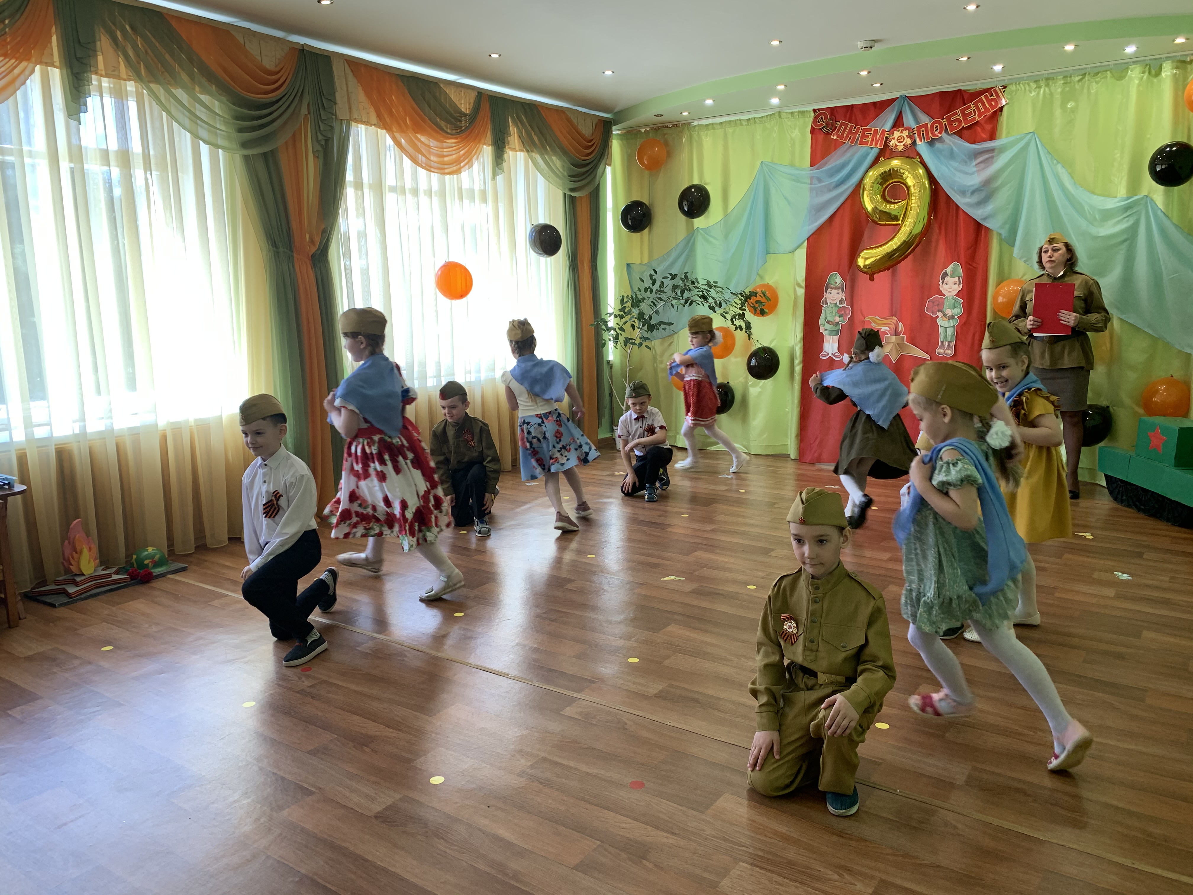 Предварительно с воспитанниками были проведены беседы о подвигах советских людей, оформлены родительские уголки, украшен зал, были сделаны всем обучающимся георгиевские ленточки – символ Дня Победы, а сам праздник стал итогом этих мероприятий. Дети слушали стоя Гимн России, аудиозапись голоса Левитана о начале войны и запись песни «Вставай страна огромная». Дошкольники исполнили песни – «Прадедушка», «Катюша», «Солдат молоденький», «Наша родина сильна». Показали танцы «Синий платочек», «Красные маки», а также читали стихи о любви к Родине, о силе, отваге солдат.