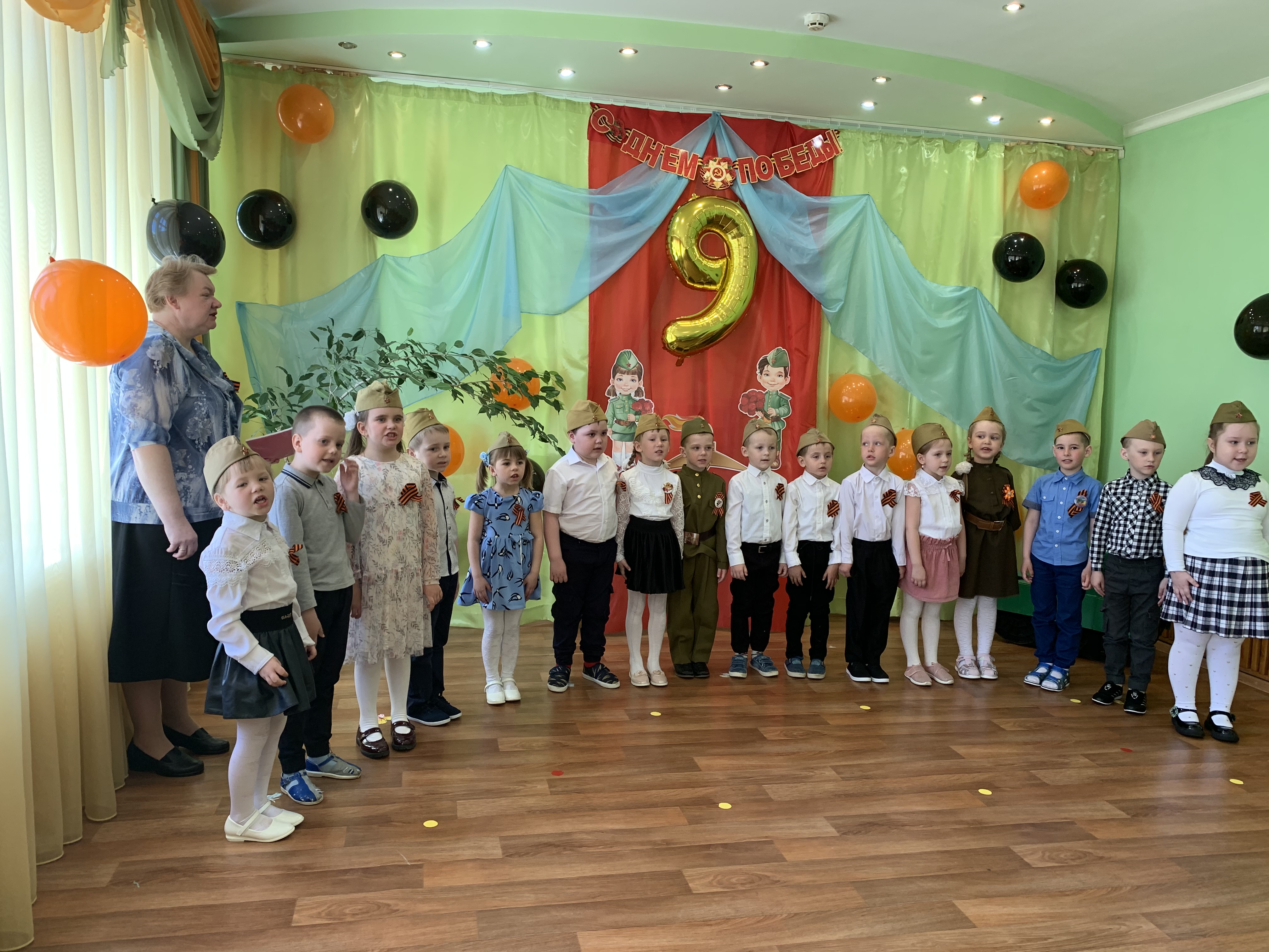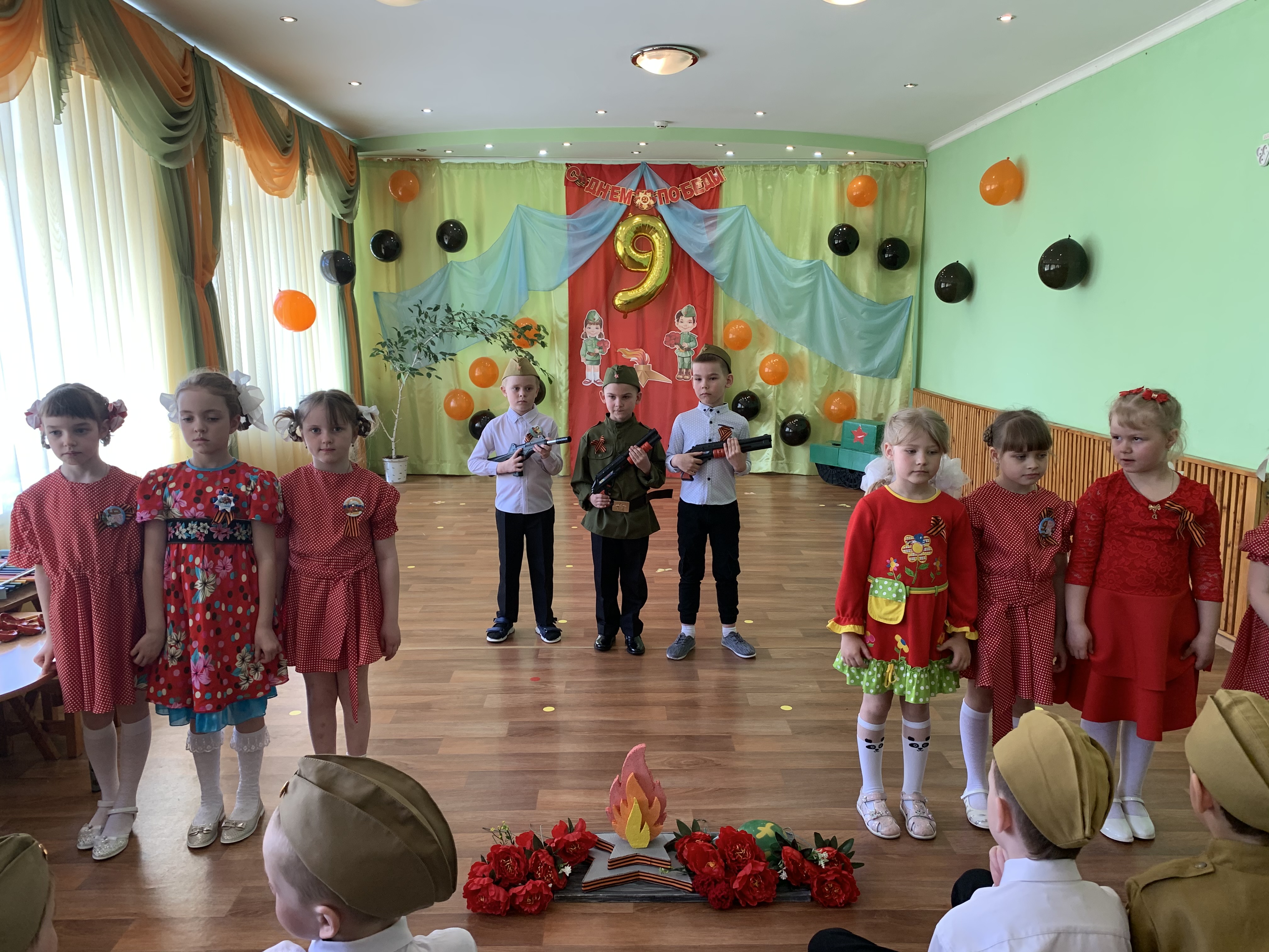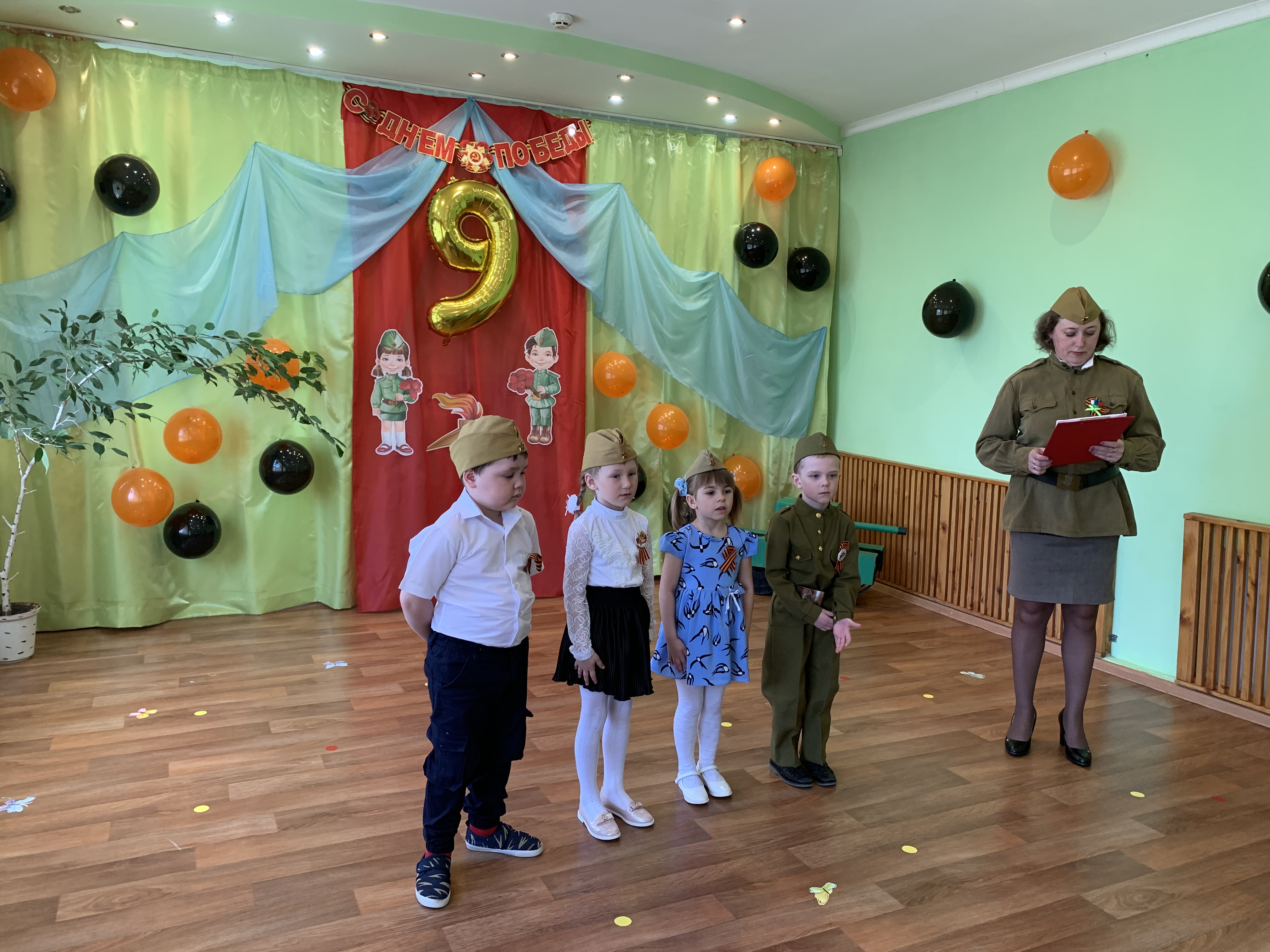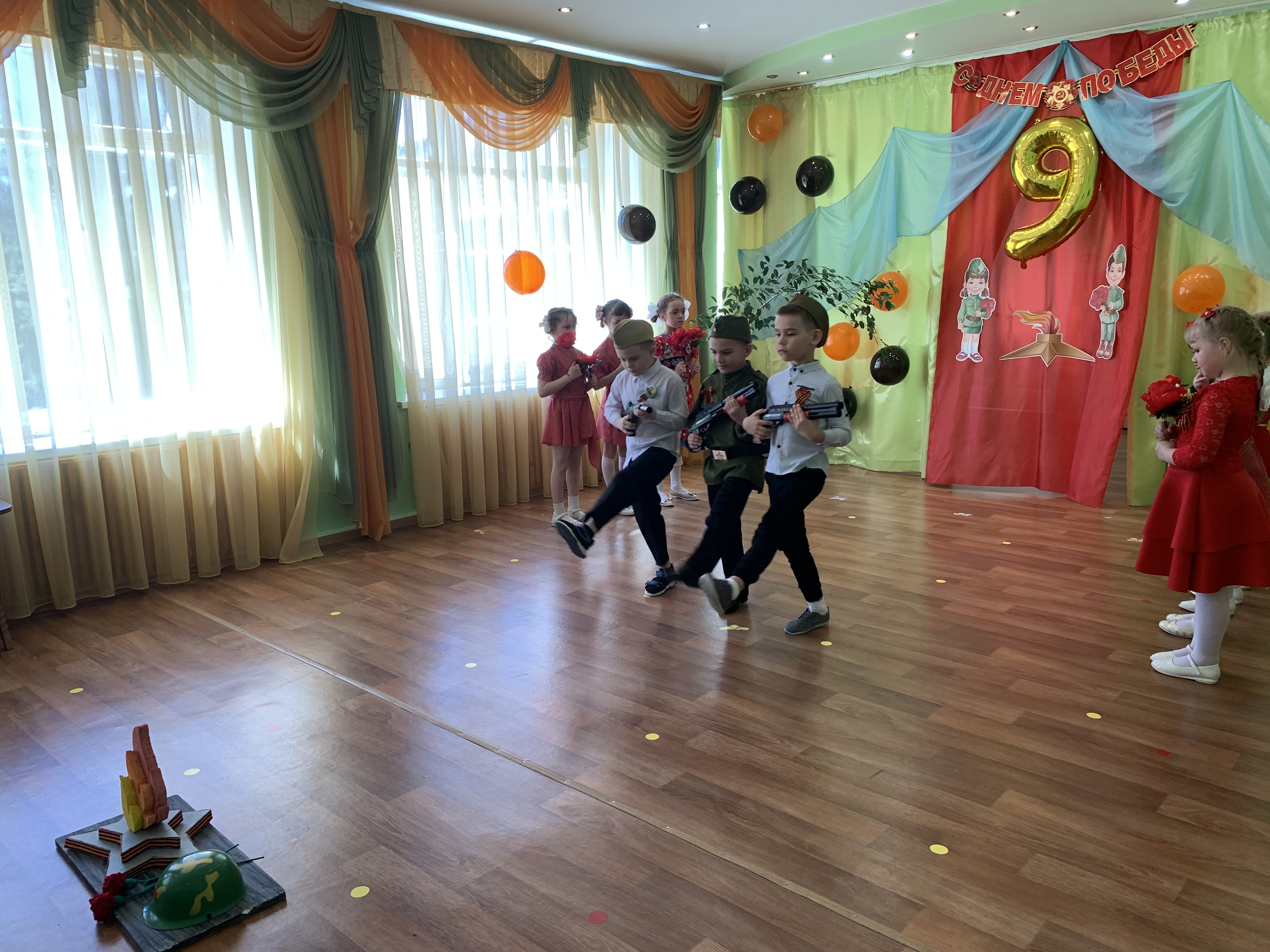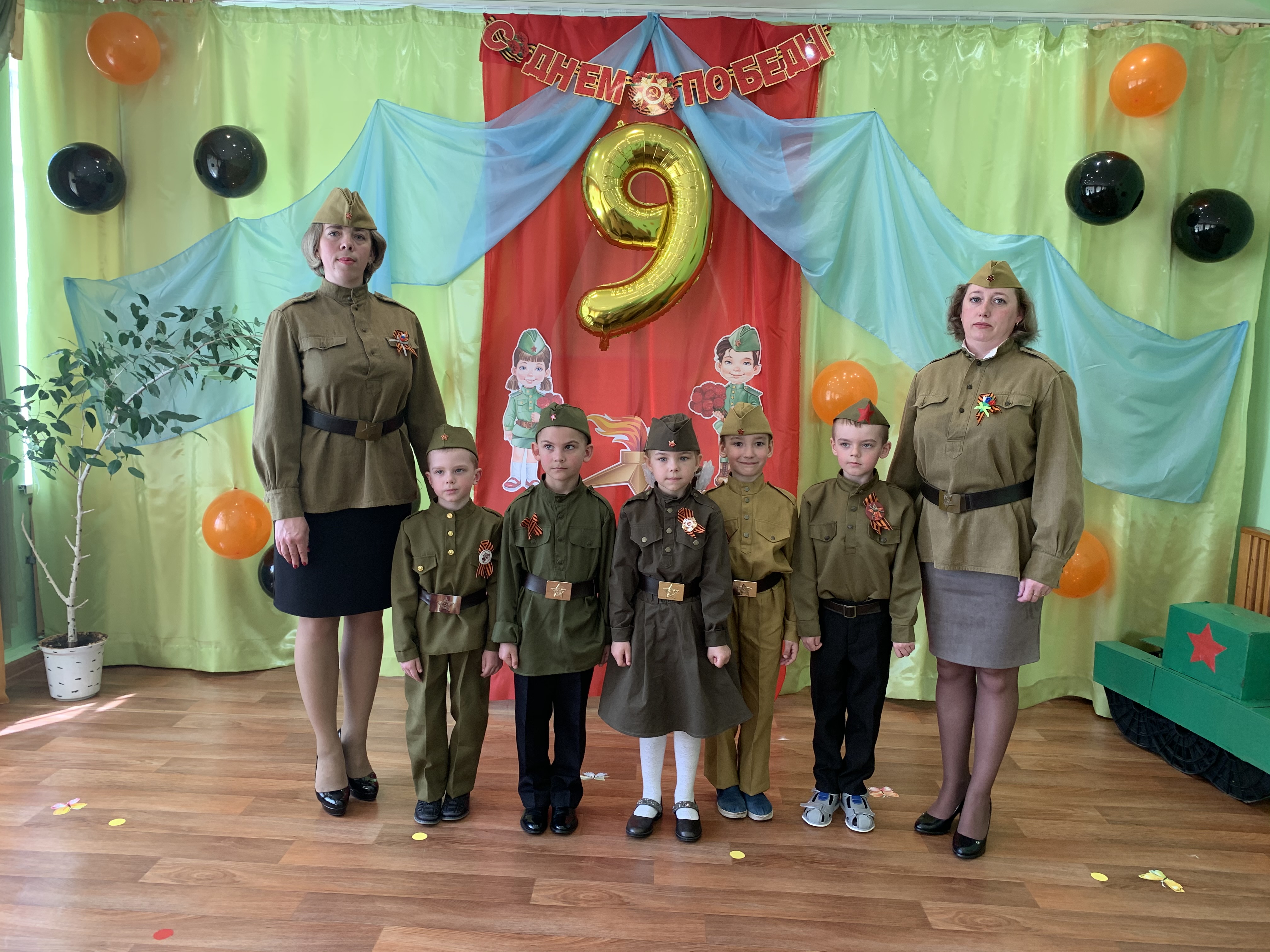 Предварительно с воспитанниками были проведены беседы о подвигах советских людей, оформлены родительские уголки, украшен зал, были сделаны всем обучающимся георгиевские ленточки – символ Дня Победы, а сам праздник стал итогом этих мероприятий. Дети слушали стоя Гимн России, аудиозапись голоса Левитана о начале войны и запись песни «Вставай страна огромная». Дошкольники исполнили песни – «Прадедушка», «Катюша», «Солдат молоденький», «Наша родина сильна». Показали танцы «Синий платочек», «Красные маки», а также читали стихи о любви к Родине, о силе, отваге солдат.